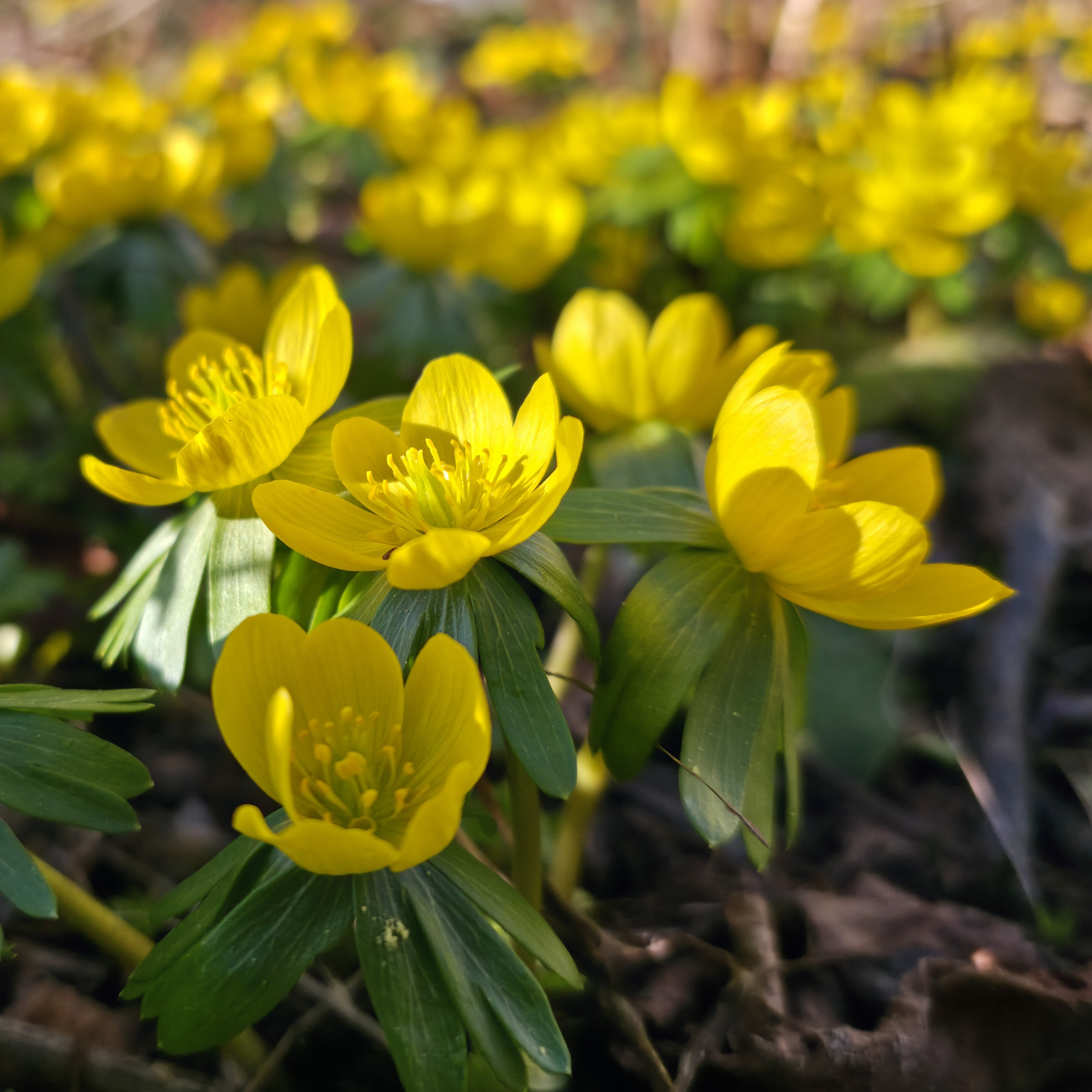 Auch die Winterlinge haben es ein paar Tage danach geschafft und sind zahlreich erschienen. Sie scheinen sich bei uns wirklich wohlzufühlen, denn es werden jedes Jahr mehr. Die Bienen lieben sie und nutzen das Nektar- und Pollenangebot als willkommene erste „richtige“ Nahrung nach den kalten Wintertagen.